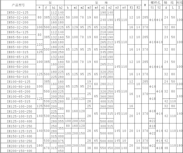 IH型不銹鋼化工泵性能參數表