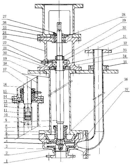 1、 泵體 2、葉輪螺母 3、葉輪 4、墊片 5、泵蓋 6、立柱管 7、導(dǎo)軸管 8、導(dǎo)軸承蓋 9、泵軸 10、傳動套 11、聯(lián)接管 12、鍵 13、中間導(dǎo)軸承壓蓋 14、中間導(dǎo)軸承座 15、中間導(dǎo)軸承 16、泵軸 17、潤滑液管路 18、立柱管 19、支承座 20、甩液套 21、下軸承壓蓋 22、黃油杯 23、軸承座 24、上軸承檔圖 25、軸承 26、電機(jī)座 27、黃油杯 28、上軸承壓蓋 29、鎖緊螺母 30、下軸承擋圈 31、出液管 32、出液口法蘭 33、軸承 34、油封 35、對半法蘭 36、鍵 37、墊片 38、下軸承壓蓋