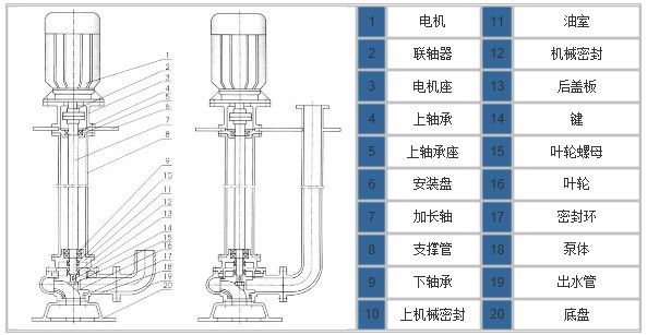 要確認液下排污泵型號首先我們應該要了解此類水泵的分類,一般的液下排污泵可分為三種,第一種是單管的,所謂的單管也就是電機下面一根管連接泵頭。第二種是雙管,所謂的雙管就是在單管的基礎上面又加了一根出水管,這個便是雙管。第三種是方盤,所謂的方盤就是在雙管的基礎上面又加了一個方盤固定。