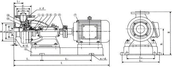 6、如果更換滾珠軸承或泵軸時(shí),必須拆下機(jī)架,松開前端軸承蓋4只螺釘。拆下泵軸后端螺母和聯(lián)軸器,將泵軸向前端方向打出即可,再后拆下后端軸封蓋。