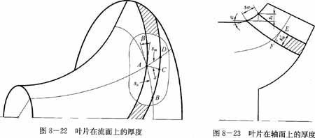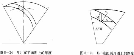 用一個垂直軸面截線的EF線(圖8-23)為母線的錐面去截葉片,并展開在平面上(圖8-25)。因為該面垂直葉片上的線(軸面截線),所以其上反映葉片的真實厚度δ,由此圓錐面上的圓周方向的厚度應等于流面上的圓周厚度,由圖8-25