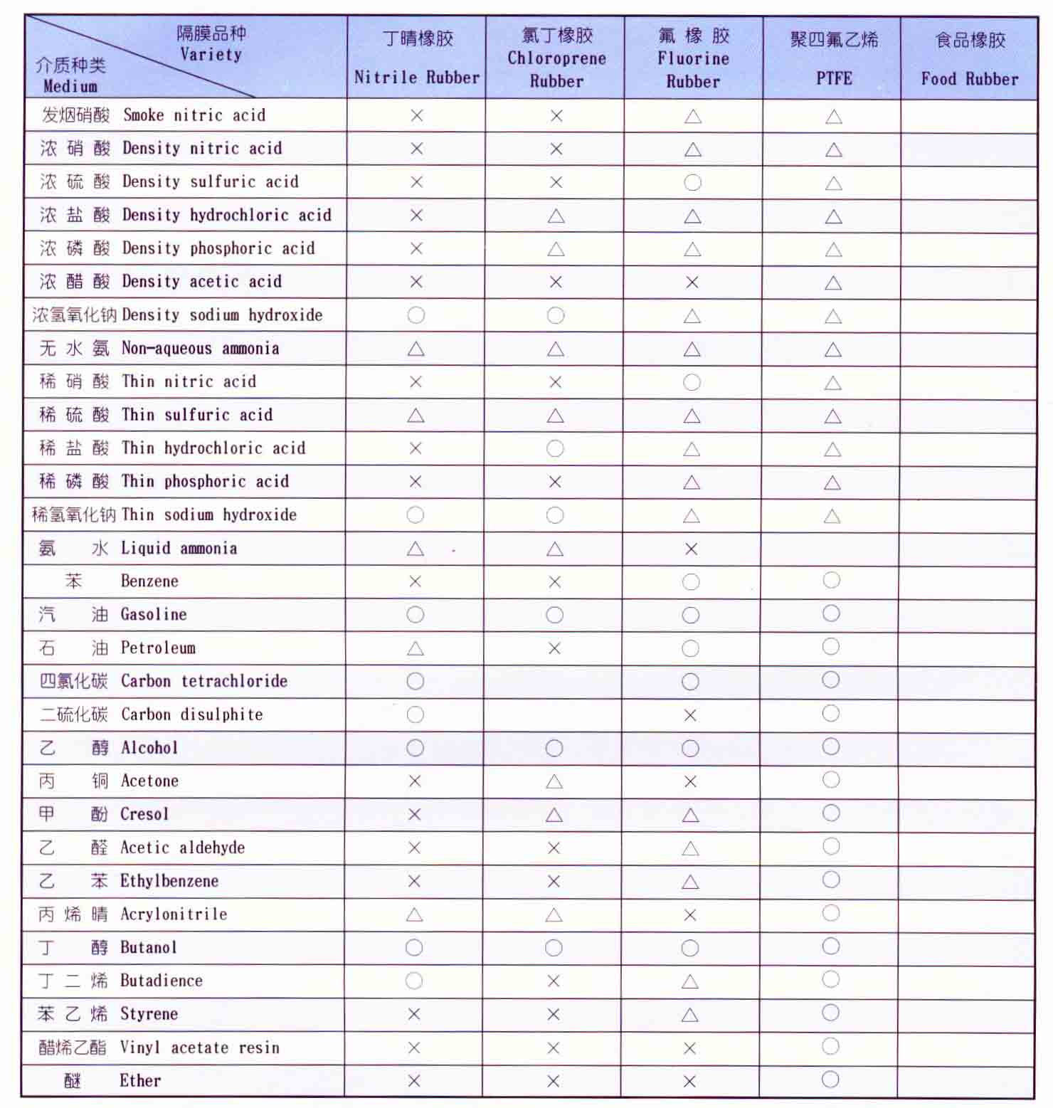 注:○——表示壽命較長;△——表示壽命一般;×——表示不可用。本表僅從耐腐性考慮,因聚四氟乙烯彈性比橡膠差,所以實際使用壽命因壓力,隔膜泵、行程、雜質等因素影響而異。