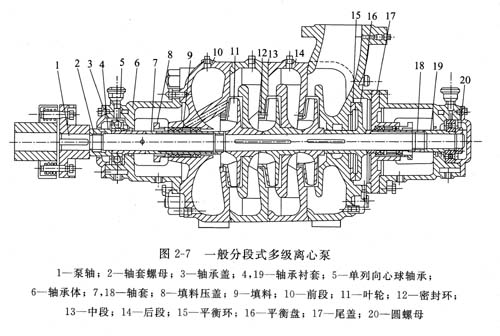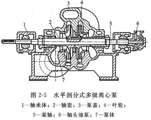 圖2—5所示為水平剖分式多級離心泵結構。這種泵采用蝸殼形泵體,每個葉輪的外圍都有相應的蝸殼,相當于將幾個單級蝸殼泵裝在同一根軸上串聯工作,所以又叫蝸殼式多級泵。由于泵體是水平剖分式,吸人口和排出臥都直接鑄在泵體上,檢修時很方便,只需