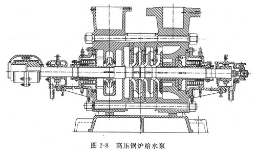 根據使用場合不同,分段式多級離心泵可分為一般分段式多級離心泵(見圖2-7),中、低壓鍋爐給水泵和高壓鍋爐給水泵(見圖2-8)。