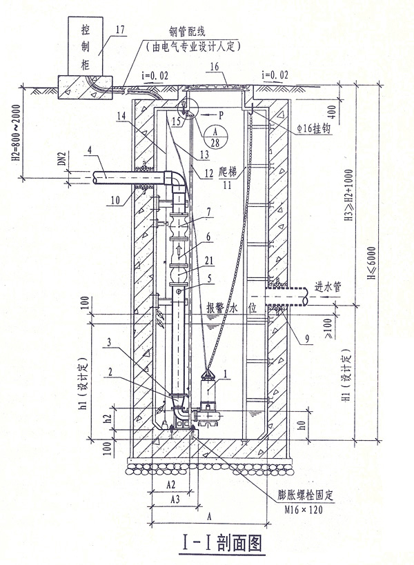 4.潛水排污泵控制柜安裝位置由單項工程設計考慮,其型號規格可由泵廠配套供應。池外電線電纜應穿管敷設。