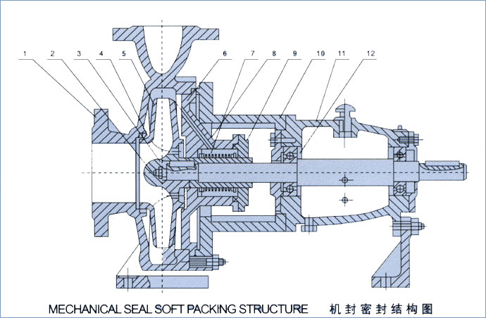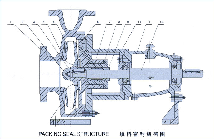 IH型化工泵結(jié)構(gòu)圖1、泵體2、葉輪螺母3、止動墊圈4、密封環(huán)5、葉輪6、泵蓋7、機(jī)械密封8、填料壓蓋9、軸套10、中間托架11、懸架12、泵軸