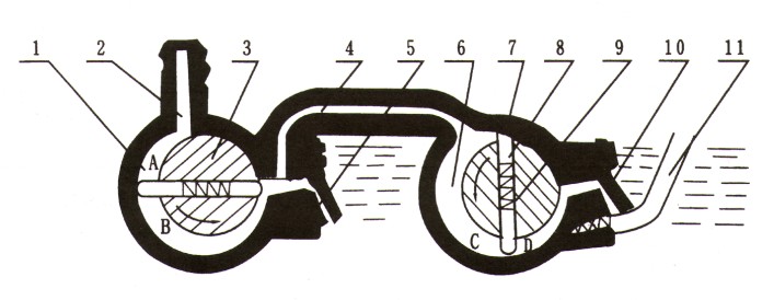 八、2X型旋片式真空泵的組成部分及結(jié)構(gòu)圖: 2X系列的各種真空泵的外形和結(jié)構(gòu)是基本相同的,泵由電機(jī)經(jīng)三角皮帶傳動(dòng)到轉(zhuǎn)子。電動(dòng)機(jī)和泵用螺釘卡板固定在底盤(pán)上。 在2X型旋片式真空泵體內(nèi)壓入一個(gè)中隔板、將真空泵殼分成高低真空室,各室都有排氣門(mén),高真空室排氣與低真空氣相通。高轉(zhuǎn)子前端伸出前軸;后端伸出后軸。前軸通過(guò)前端板的軸承支持、經(jīng)過(guò)油密封室而伸出前端板外:后軸由中隔板上的軸承支持。而伸入低真空室內(nèi),低真空室轉(zhuǎn)子則裝在后軸上、故高低轉(zhuǎn)子均由前軸帶動(dòng)。高低轉(zhuǎn)子都有對(duì)開(kāi)的槽子,呈“T”形的旋片由彈簧支撐開(kāi)而裝于槽內(nèi)。2X型旋片式真空泵的進(jìn)氣口處有過(guò)濾網(wǎng),而排氣口處有擋油網(wǎng),視鏡左邊有摻氣閥,下邊有放油塞。 |