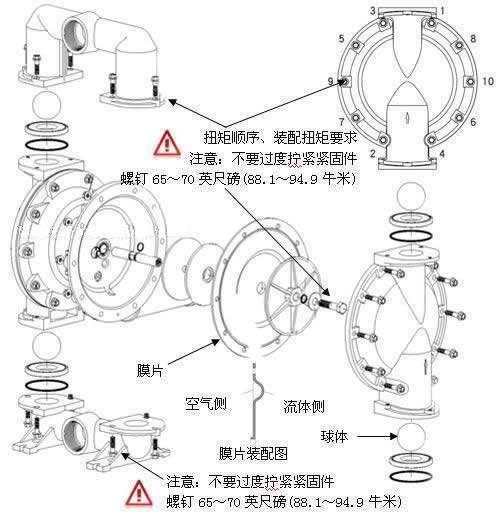 氣動隔膜泵的維修可參考上例圖片進行拆解泵體,可依據下例故障對相關部件進行更換: