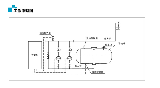 設備投入使用,自來水管網的水進入穩流流罐,罐內空氣從真空消除器排出,待水充滿后,真空消除器自動關閉。當自來水管網壓力能夠滿足用水要求時,系統由旁通止回閥向用水管網直接供水;當自來水管網壓力不能滿足用水要求時,系統壓力信號由遠傳壓力表反饋給變頻控制器,水泵運行,并根據用水量的大小自動調節轉速恒壓供水,若運轉水泵達到工頻轉速時,則啟動另一臺水泵變頻運轉。水泵供水時,若自來水管網的水量大于水泵流量,系統保持正常供水:用水高峰時,若自來水管網水量小于小泵流量量,穩流罐內的水作為補充水源仍然能正常供水,此時,空氣由真空消除器進入穩流罐,罐內真空遭到破壞,確保了自來水管網不產生負壓,用水高峰過后,系統又恢復到正常供水狀態。當自來水管網停水,造成穩流罐液位不斷下降,液位探測器將信號反饋給變頻控制器,水泵自動停機,以保護水泵機組。夜間小流量供水且自來水管網壓力不能滿足要求時,氣壓罐可以貯存并釋放能量,避免了水泵頻繁啟動。