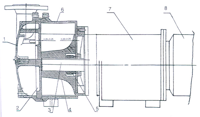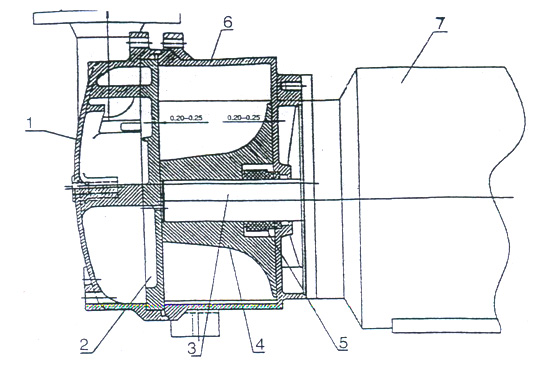 1.泵蓋 2.園盤 3.平鍵 4.葉輪 5.機械密封 6.泵體 7.電動機
