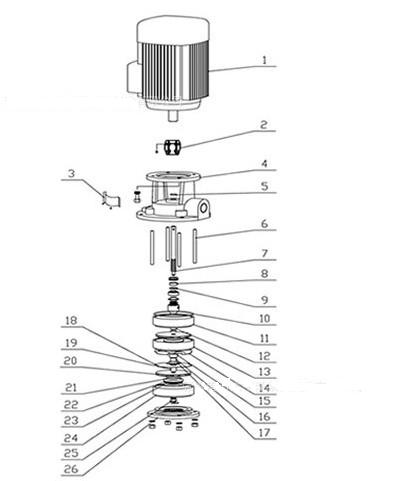 13、導流殼 14、導葉 15、軸套 16、合金軸承