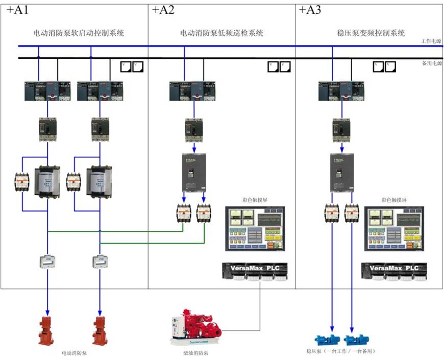 GDXJ1-□-XFS-C系列是消防電動給水泵低頻巡檢系統(tǒng)。適用于二臺以上電動給水泵,可聯(lián)動柴油消防泵。消防水泵智能自動巡檢技術(shù)是在90年代末期研制生產(chǎn)的全自動微機智能控制消防供水設(shè)備,自行開發(fā)的、符合國家消防法規(guī)的智能型檢測技術(shù)。特點是采用了可編程控制器(PLC)替代了消防水泵純繼電器控制技術(shù),用梯形圖語言按消防要求編程,實現(xiàn)了消防水泵智能自動巡檢。即是在平常無火災(zāi)情況下,運用自動巡檢技術(shù),使消防泵組能自動地周期性逐臺起動運行,發(fā)現(xiàn)水泵故障能以聲、光形式告知現(xiàn)場值班人員和將泵組運行、故障信息傳遞到遠方的消防中心。當火災(zāi)出現(xiàn)時,能自動退出巡檢模式,使消防泵組立即投入消防模式,即“消防優(yōu)先”原則。