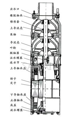 QS型充水式潛水泵由水泵、電機兩大部分組成,水泵位于電泵上部,為離心式結構。電動機位于電泵下部,為充水式三相異步電動機。充水式電動機定子繞組和鐵心直接浸在水中,冷卻效果好,不產生污染,從而突破了其他電泵工作時“O”形密封圈,機械密封件等滲水到電機腔內的弊端,大大提高了電泵的使用效率。