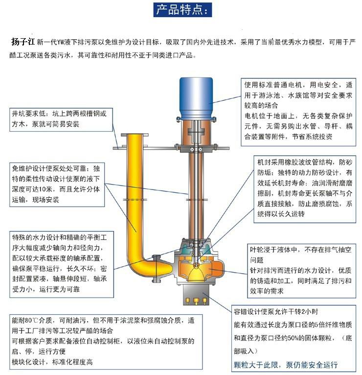 YW液下無堵塞排污泵產品特點:
