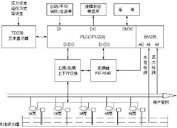 該系統由四臺大泵(22KW)與一臺小泵(5.5KW)組成;PLC部分由西門子可編程控制器S7-200系列的CPU226,文本顯示器TD200組成;變頻器采用三菱FR-A540系列,功率22KW。