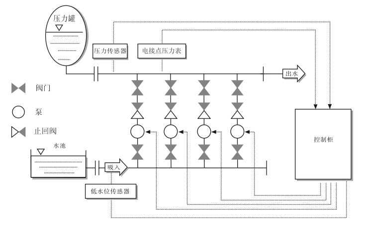 當(dāng)管網(wǎng)壓力大于啟動(dòng)壓力設(shè)定值時(shí)由與出水管路連接的壓力罐供水,如果管網(wǎng)壓力等于啟動(dòng)壓力設(shè)定值時(shí)啟動(dòng)水泵,水泵運(yùn)行中管網(wǎng)壓力達(dá)到停止壓力時(shí)停止水泵運(yùn)行,水泵啟動(dòng)后管網(wǎng)壓力超過(guò)啟動(dòng)壓力,未達(dá)到停止壓力時(shí)水泵繼續(xù)運(yùn)行;水泵全速運(yùn)行后管網(wǎng)壓力未到達(dá)啟動(dòng)壓力時(shí)水泵追加啟動(dòng)。