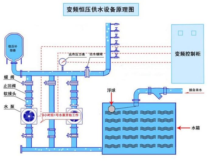 全自動變頻調速供水設備采用國際新控制基板,通過遠傳壓力表接收管網信號,經微機與設定壓力比較運算后,輸出調節參量,送給變頻器控制其輸出頻率。當用水量增大時,頻率升高,水泵電機轉速加快,增大供水量;反之亦然。