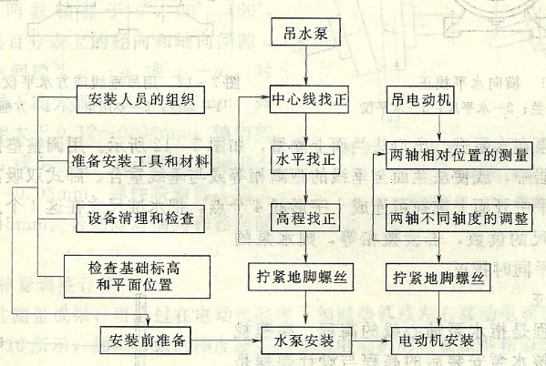 臥式離心泵安裝程序如圖所示。水泵就位前應(yīng)復(fù)查基礎(chǔ)水平和高程。水泵的中心線找正、水平找正,是安裝過(guò)程中的關(guān)鍵。