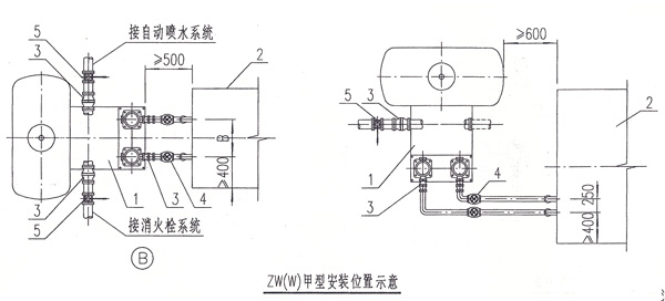 3.本設備供消防栓和自動噴水兩套系統共用時,在其出水管上設閥門分別與兩系統連接,見圖B所示