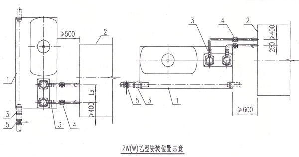 2.設在屋頂水箱間或底層水泵房的ZW(W)設備其安裝位置可參考本圖所示