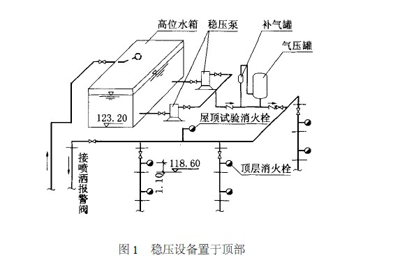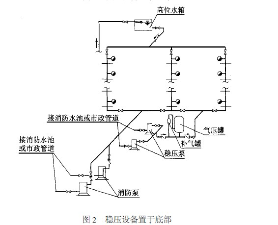 當建筑物頂部有消防水箱,但放置穩壓設備有困難時,多層建筑經常將穩壓設備放在首層或地下室內,如圖2 所示。高層建筑由于高位消防水箱距地面高差較大,若將穩壓設備放在首層或地下室時,系統的工作壓力較大,可能引起系統超壓(超過管道的允許使用壓力) ,故推薦采用放在建筑物頂部的方案。