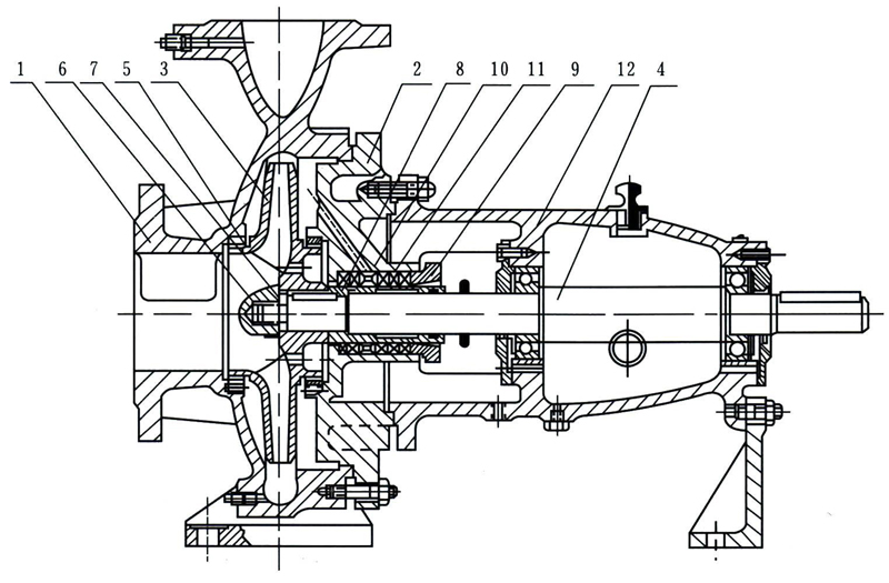 1 泵體 2 泵蓋 3 葉輪 4 軸 5 密封環 6 葉輪螺母 7 止動墊圈 8 軸套 9 填料壓蓋 10 填料環 11 填料 12 懸架軸承部件