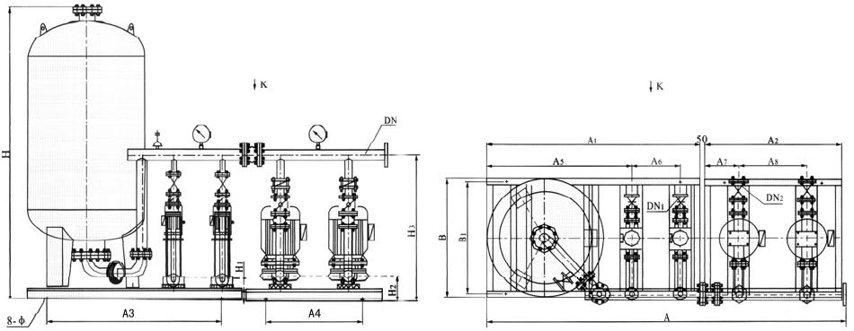 該設備可使消防給水管道系統不利點始終保持消防壓力,并利用氣壓水罐內始終儲有的30秒消防水量,以保證消防泵在運行前的消防噴淋用水;該設備利用氣壓水罐設定的運行壓力,控制水泵運行工況,達到增壓穩壓的功能。