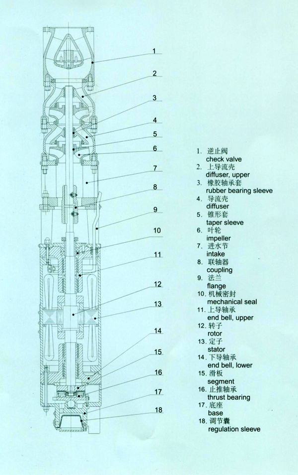 QJR系列高溫井用潛水電泵是我公司新開發的用于熱水中的立式單級、多級潛水電泵,泵與電機連為一體,潛入水中工作。該系列電泵是深井提取熱水的主要工具,適于城鄉、工礦企業所需熱水。該系列電泵所配YQSR系列高溫井用潛水三相異步電動機,是在引進德國里茨公司潛水電機技術及美國雷達潛油電機技術基礎上自行設計制造的。它從結構上充分考慮了汽化、鈣化和含砂的影響,從電磁和密封材料上采用了F級耐高溫有效的保證電機在高溫情況下的工作壽命。該系列電泵所配水泵,從材料和結構上充分考慮了在熱水中使用要求。 QJR電泵:導殼與導殼為螺栓聯接,軸瓦為橡膠軸承,葉輪定位為錐套。使用條件泵進水口至少應浸入動水位3m以下,電機底部距井底不少于5m,井應正直。 a. 水溫不高于120℃。 b. 水中固體含量(按重量計)不大于0.01%。 c. 水的酸堿度PH值為6.5-8.5。 d. 水中硫化物含量不大于1.5mg/L。 e. 水中氯離子含量不大于400mg/L。