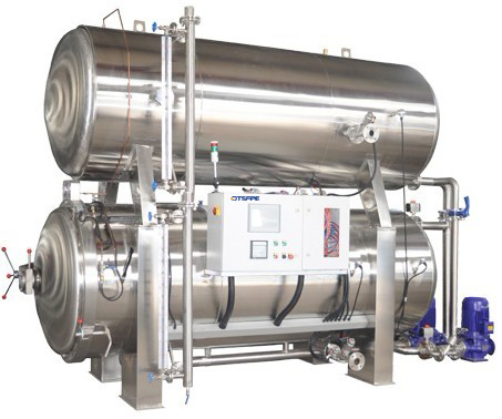 2.下鍋升溫:聯通閥、循環進水閥、循環出水閥、管道離心循環泵、蒸汽閥開啟,鍋內壓力自動保持設定壓力,當達到設定的殺菌溫度后,進入保溫步(殺菌步)。