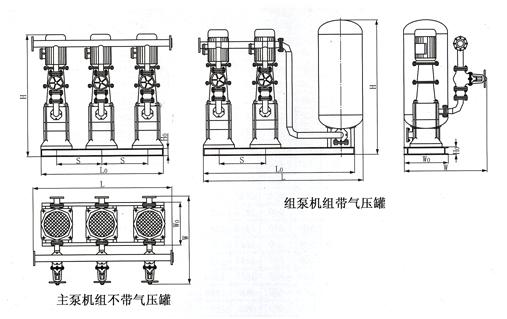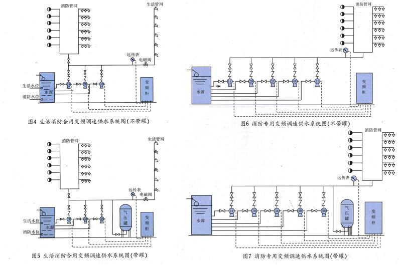 變頻供水成套設備:主泵組 變頻供水控制系統;系統正常運行時,用戶用水管網上的壓力傳感器對用戶水壓進行數據采樣,并將壓力信號轉換為電信號,傳輸至PID調節器,然后與用戶設定的壓力值進行比較和運算, 并將比較和運算的結果轉換為頻率調節信號和水泵啟動臺數信號送至變頻器;變頻器據以調節水泵電機的電源頻率,進而調整水泵轉速;可編程控制器根據PID調節器傳輸過來的水泵啟動臺數信號控制水泵的運轉。 通過對水泵的啟動和停止臺數及其中變頻泵轉速的調節,將用戶管網中的水壓穩定于用戶預先設定的壓力值,使供水泵組“提升”的水量與用戶管網不斷變化的用水量保持一致,達到“變量恒壓供水”的目的.